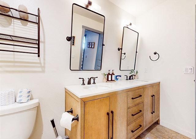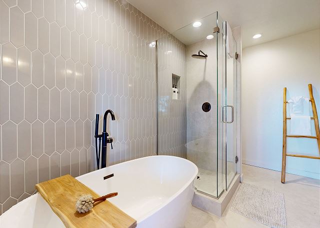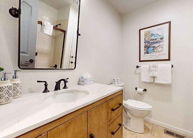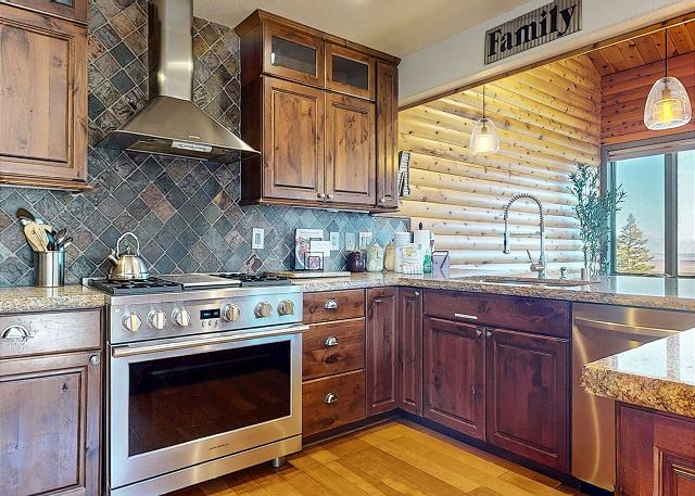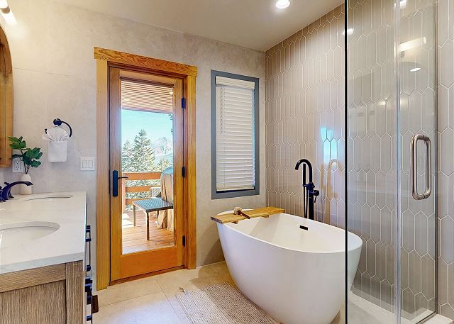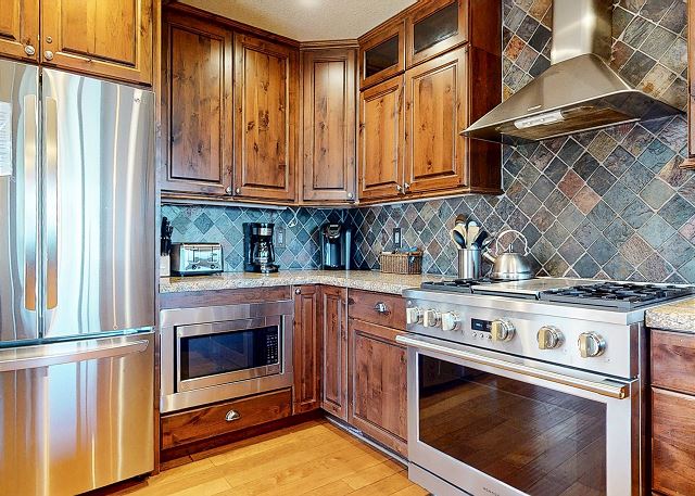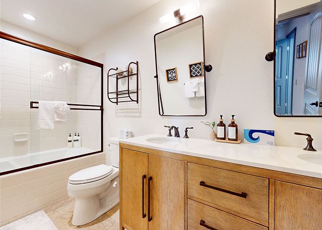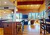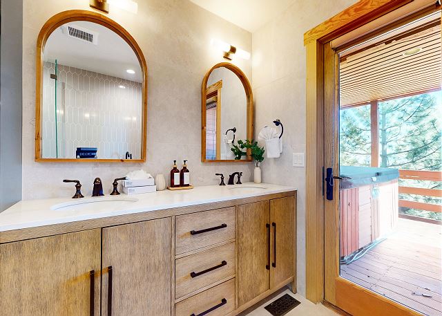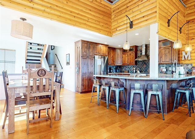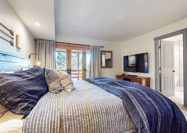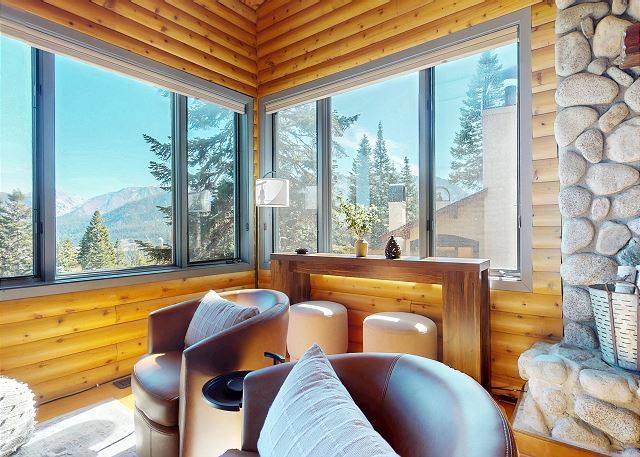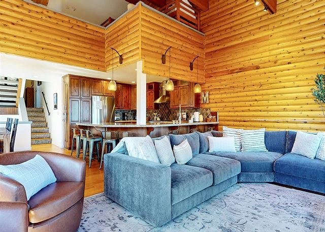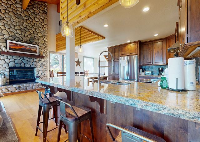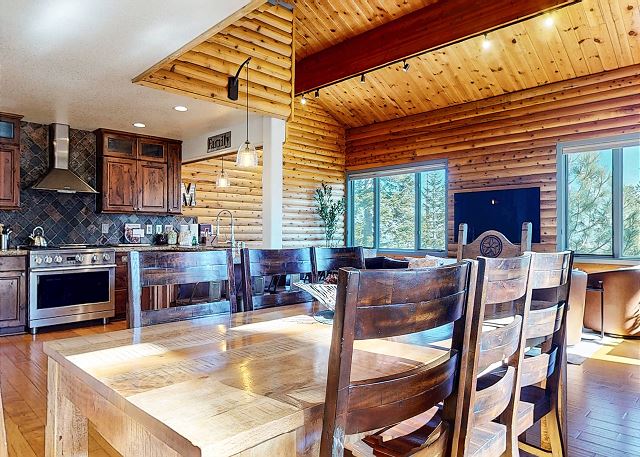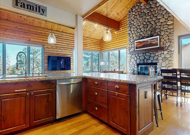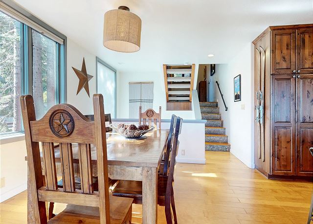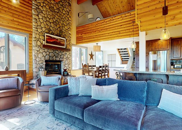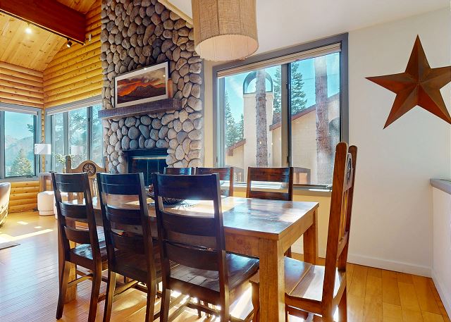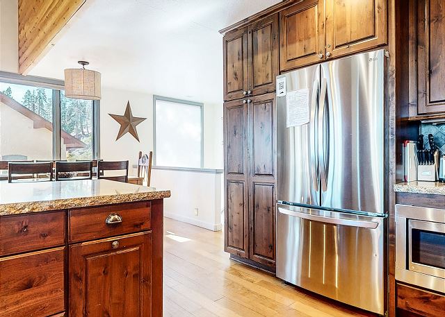 Located on the back deck is a private hot tub for soaking after a long day of skiing or hiking and a gas BBQ grill. With a fully stocked kitchen, dining table for 8 and additional seating for 8, the open plan living kitchen level is great space for a family dinner. A private washer/dryer and gas fireplace are just more amenities to make your stay more comfortable. All guests receive complimentary full access to Snowcreek Athletic Club to enjoy facilities including indoor heated pool, steam/sauna, full fitness facility, yoga, pilates and cycle studio and more.