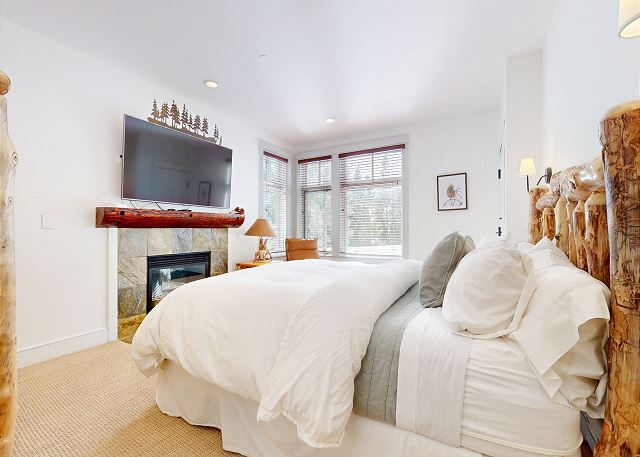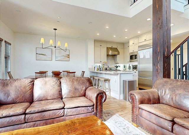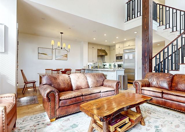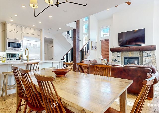 Easy walk / ski-in ski-out to Eagle Lodge! Newly renovated, 3-story townhome with 4 bedrooms + loft, 3.5 baths in Juniper Crest - only 100 yards to Eagle Lodge! Enjoy unobstructed, beautiful views from the living room bay windows and relax by the gas fireplace. The living room offers a 65” TV with comfortable seating overlooking the Valentine Reserve and Mammoth Creek with walking and Town Loop biking trails just outside the back door. A private balcony includes an outdoor dining area as well as a gas bbq grill. New flooring throughout with hydronic radiant heating ensures quiet nights without the loud noise of traditional heaters.