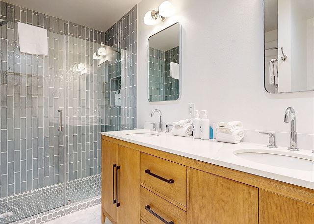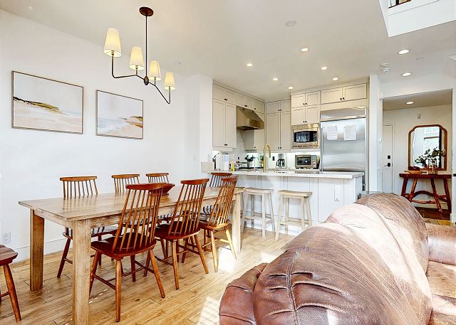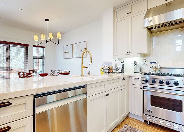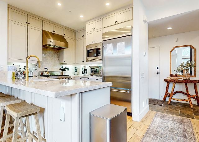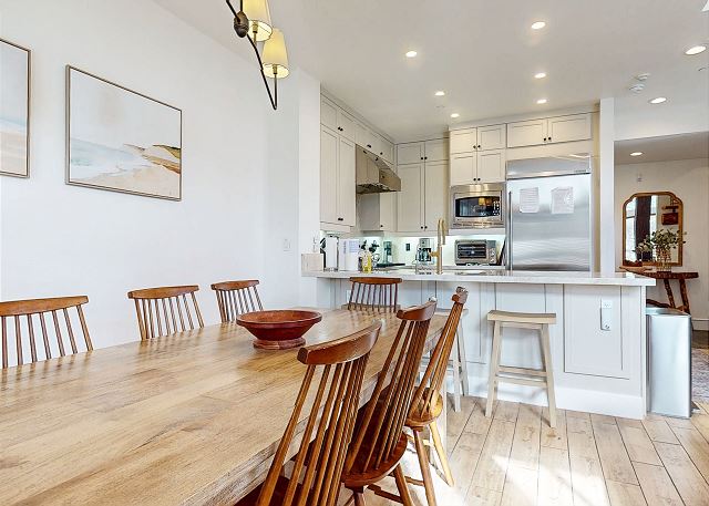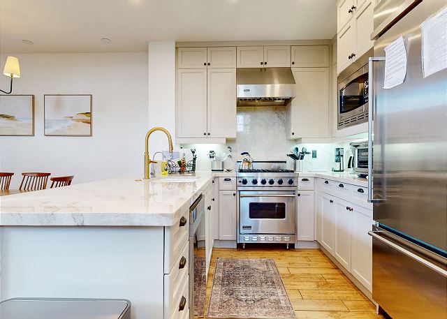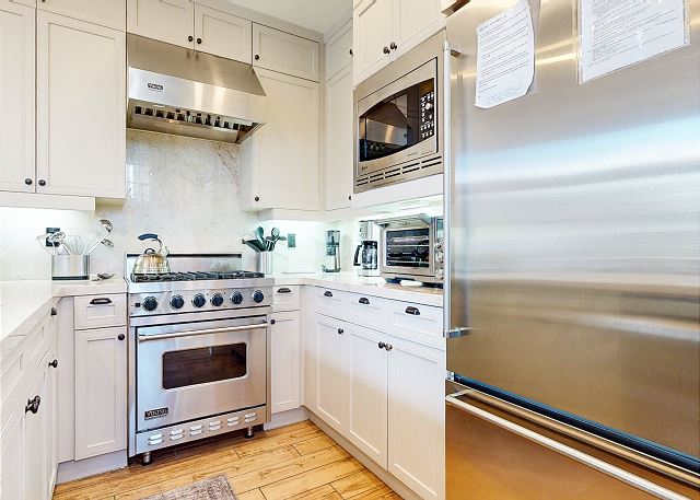 The chef’s kitchen is equipped with all modern appliances and accessories including a Viking range and refrigerator, a new Samsung dishwasher, coffee grinder and coffee maker, and new toaster oven. The kitchen is fully stocked with new pots and pans, brand new silverware and dinnerware, plenty of cooking accessories and all the items you need to comfortably prepare meals.