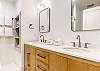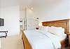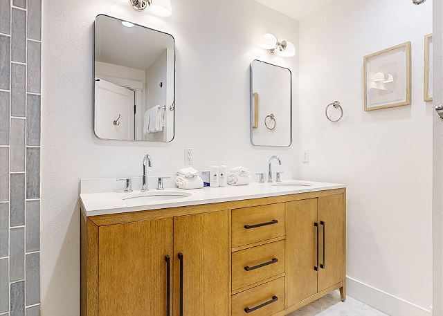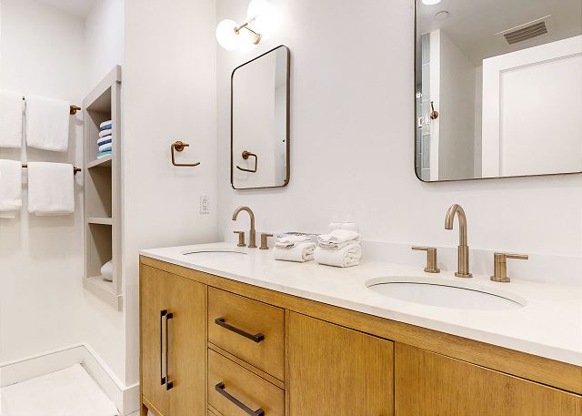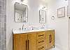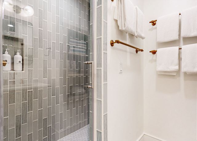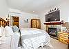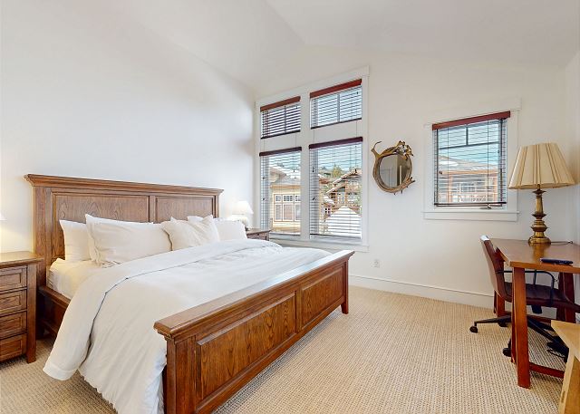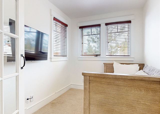 The four bedrooms consist of the following: Primary bedroom 1 features a King-size bed, TV, and a work-from-home desk area with plug-in 2 computer monitors and an easy-to-use laptop docking station. Primary bedroom 2 also features a King-size bed, TV, and a private balcony with a sitting area overlooking a gorgeous view. An additional alcove room/loft on this upper level features a twin daybed with a twin trundle and TV. On the lower level of the home, Bedroom 3 features a King-size bed, TV, fireplace, and a private outside patio with a jacuzzi. Bedroom 4 is furnished with 2 sets of Twin bunk beds, offering 4 Twin beds. The home is equipped with a private laundry room downstairs, offering a washer and dryer.