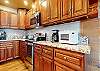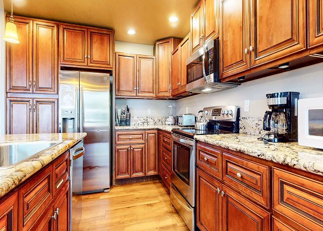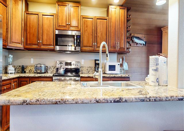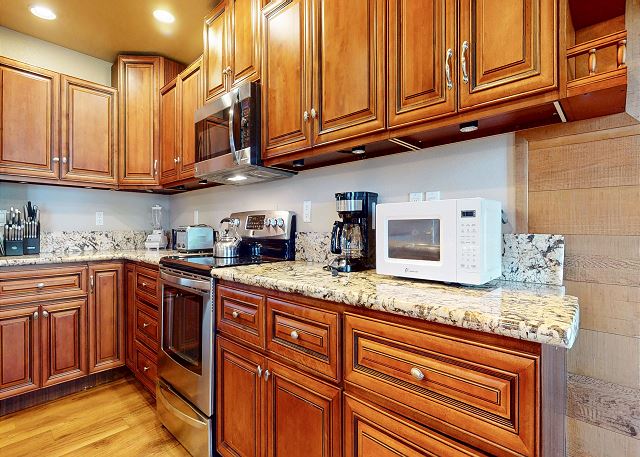 This property enjoys additional luxury and views from a separate deck with private covered jacuzzi and gas BBQ grill off the master bedroom. The living area features a large kitchen with granite countertops, island w/bar stools, river-rock fireplace, TV with DVD player, 3/4 bath, and private washer/dryer.